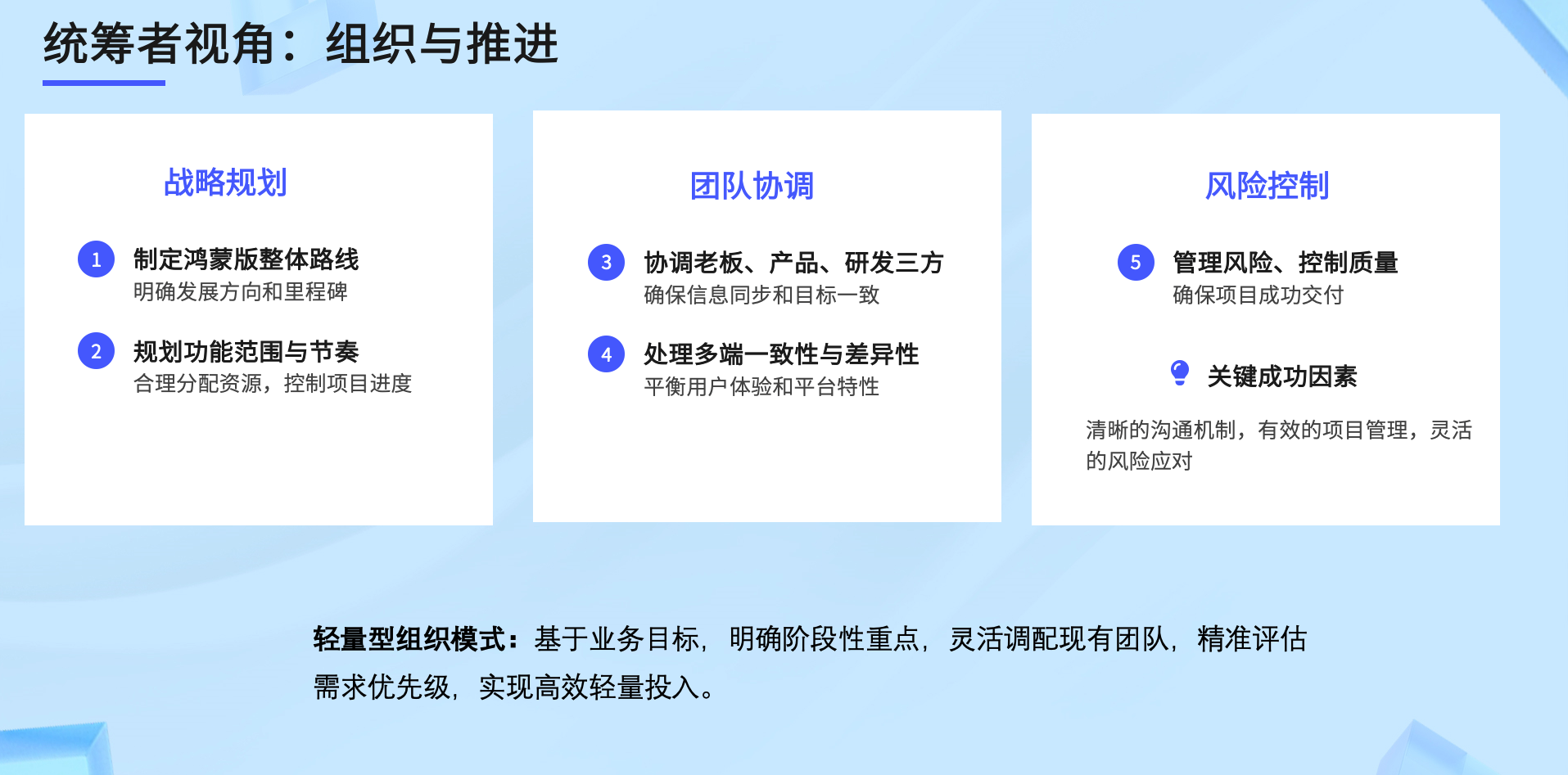 • 统筹层面:由我负责整体项目节奏把控、风险决策及鸿蒙生态对接。