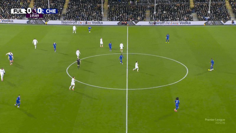 以这次客场对阵富勒姆的进攻为例,10号位恩佐-费尔南德斯拉边,帕尔默牵扯防线,古斯托则成为6号位莫伊塞斯-凯塞多和安德烈-桑托斯之间的连接点。