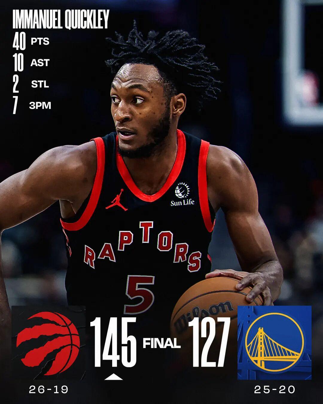 奎克利40分库里16中6 猛龙大胜勇士