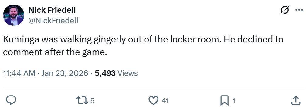 结果本场库明加又半场伤退,赛后勇士记者Nick Friedell透露,库明加一瘸一拐离开球馆,并且拒绝了采访,科尔表示库明加将接受核磁共振检查。