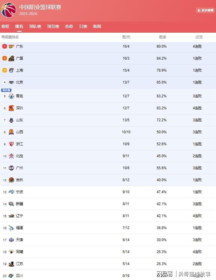 KAIYUN-CBA最新排名!差距仅1场,3队抢第1;山东冲前4,辽宁跌出季后赛